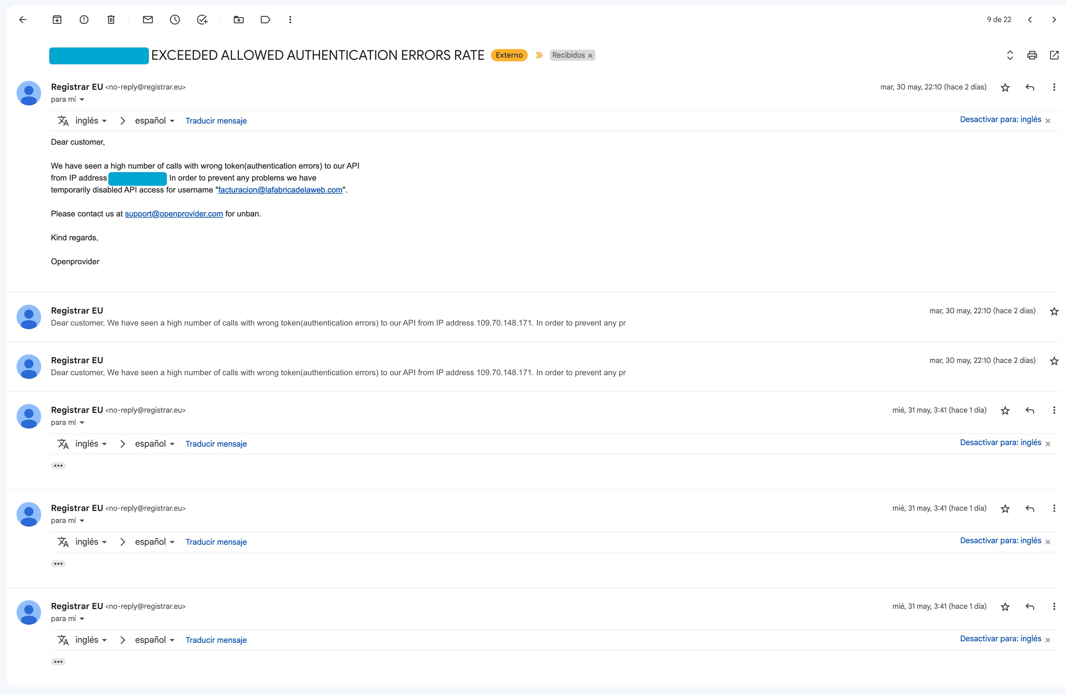 Así es que decidí cambiarme de proveedor de panel con todo lo que ello conlleva, ahora no dejo de recibir correos diciendo que la IP de donde me conecto hace muchas conexiones con la contraseña incorrecta y que por ende me han bloqueado, que debo contactar a soporte para que me desbloqueen.